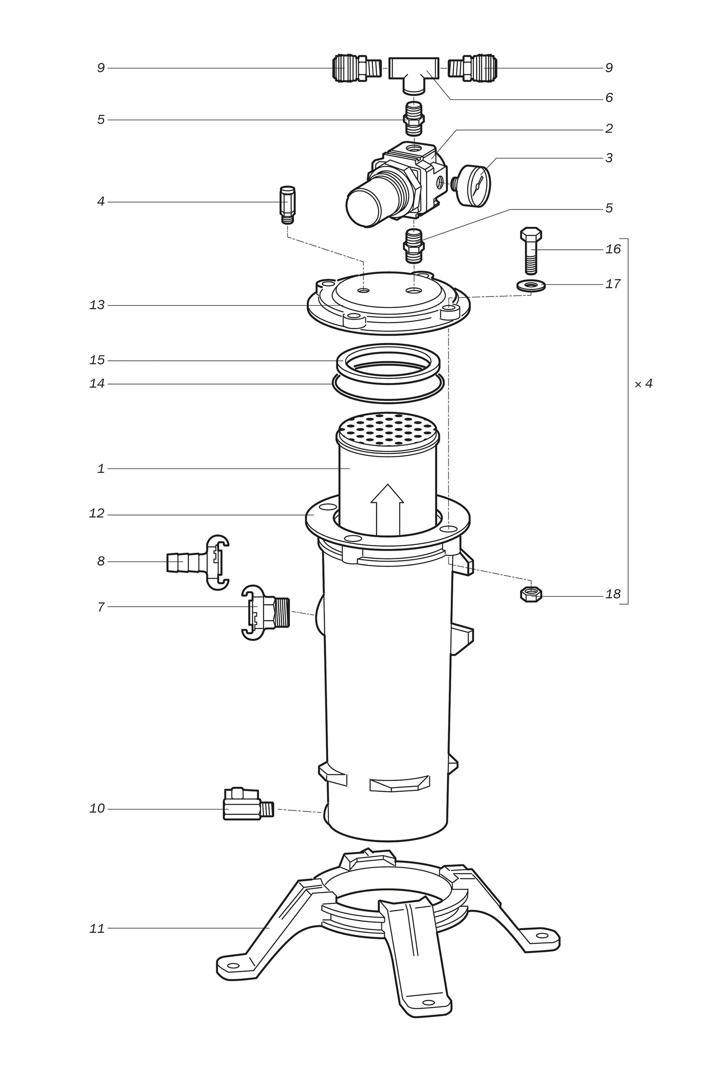 Schematische illustratie van de Contracor BAF Ademluchtfilter met genummerde onderdelen voor duidelijke identificatie.