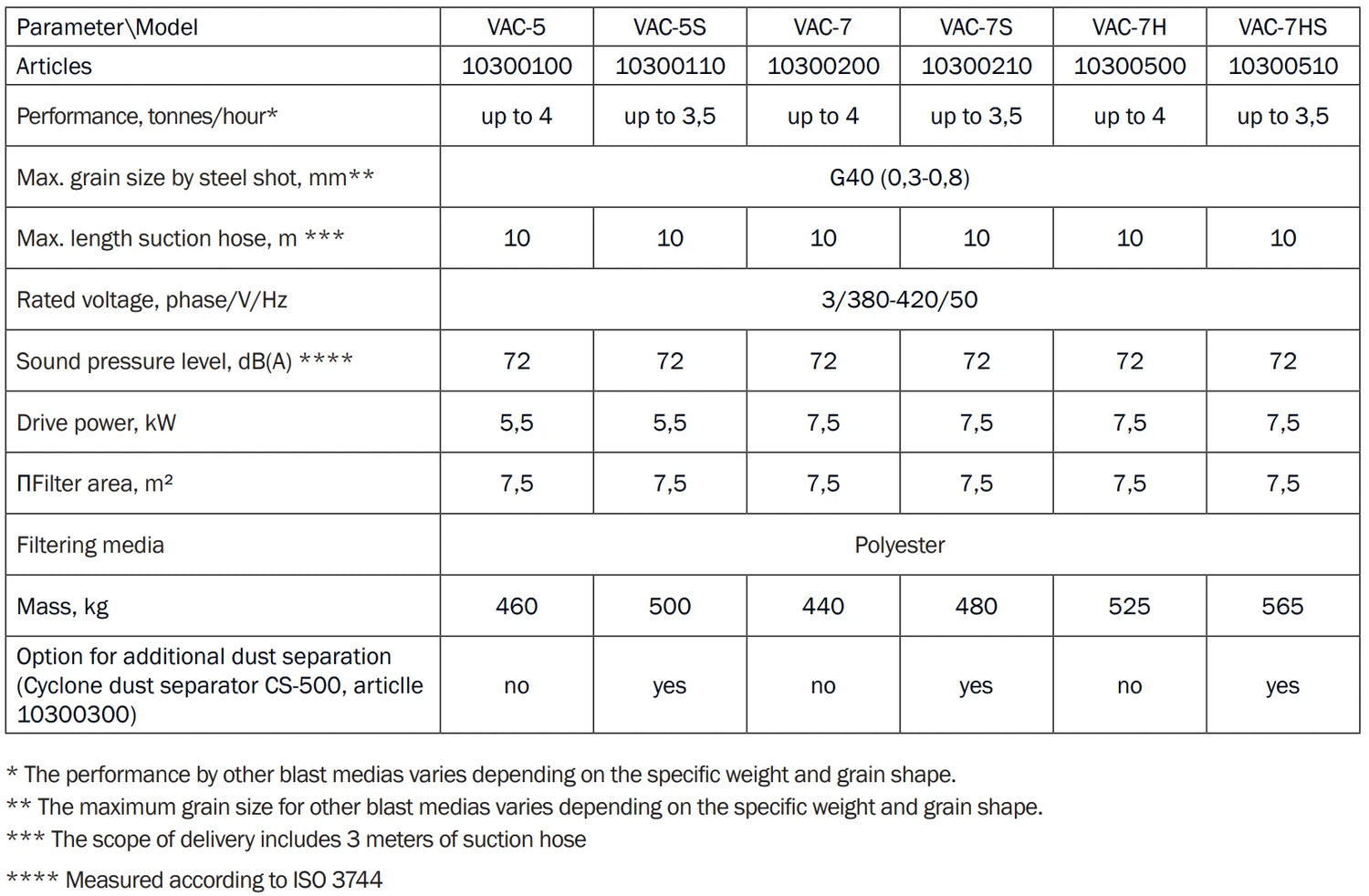 - VAC-7S: Speziell für mineralische Strahlmittel entwickelt, die in der Regel mehr Staub erzeugen. Diese Version enthält einen separaten Vorabscheider (SC-500), der Staub und unerwünschte Partikel effektiv trennt und so die Reinigung noch effizienter macht.